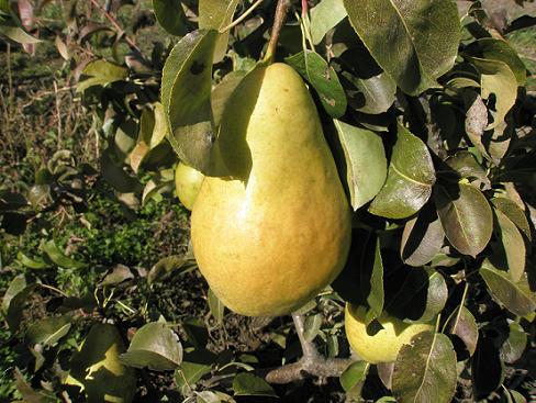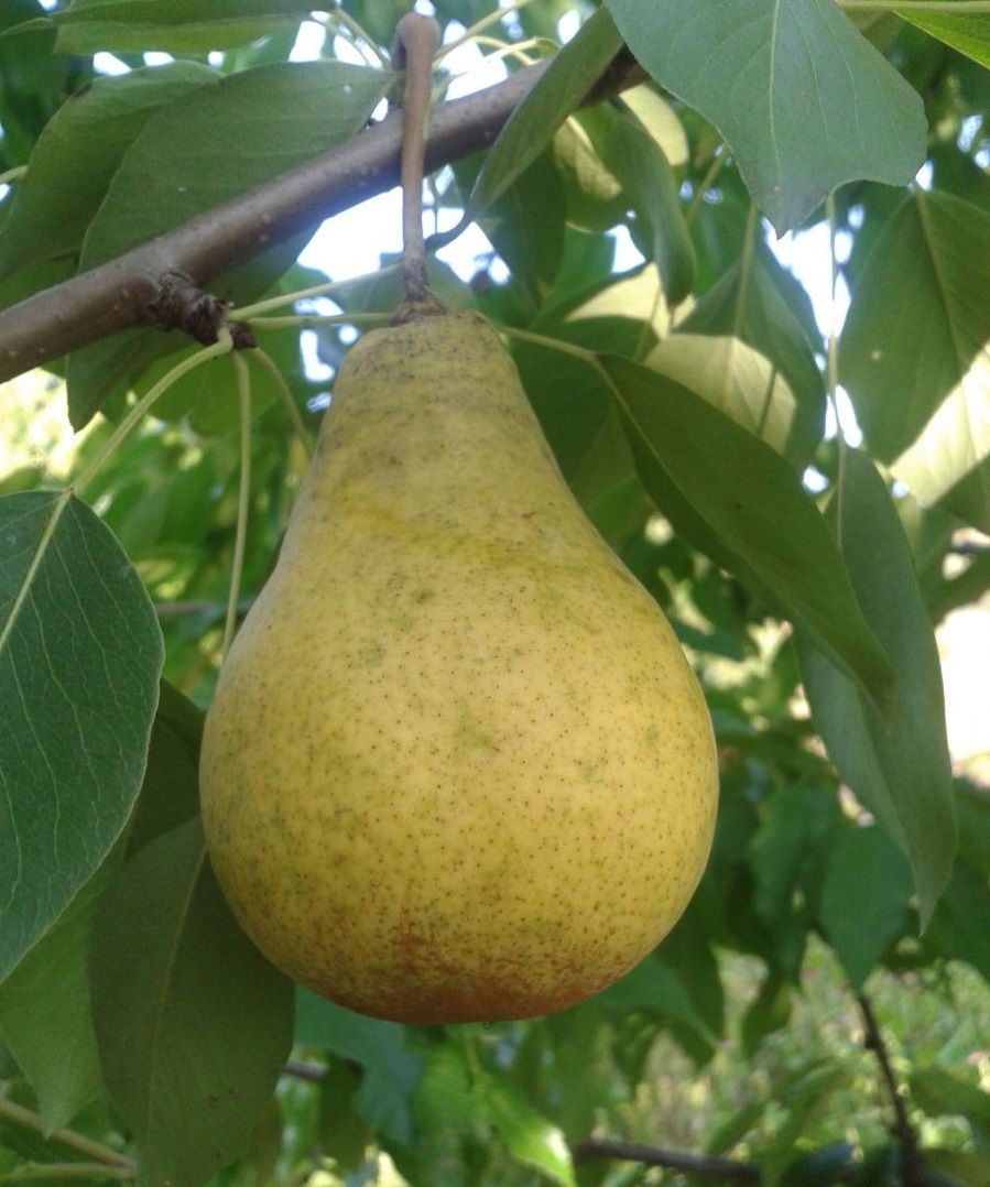 Плоды выше средней величины, широкогрушевидной формы. Кожица тонкая, гладкая, блестящая, слегка маслянистая на ощупь, в период съёмной зрелости плодов зеленовато-жёлтая, в потребительской светло-жёлтая со слабым розовым размытым румянцем на солнечной стороне, покрывающим приблизительно треть плода. Подкожные точки мелкие, зеленоватые или светло-коричневые.