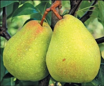Плоды крупные, массой 180-200 г, грушевидной формы, выравненные. Кожица плодов желтовато-зеленая с многочисленными мелкими желтыми и зелеными подкожными точками, гладкая, средней толщины, нежная, блестящая. Покровная окраска в виде слабого или достаточно сильного карминного румянца на 1/4—1/3 поверхности плода.