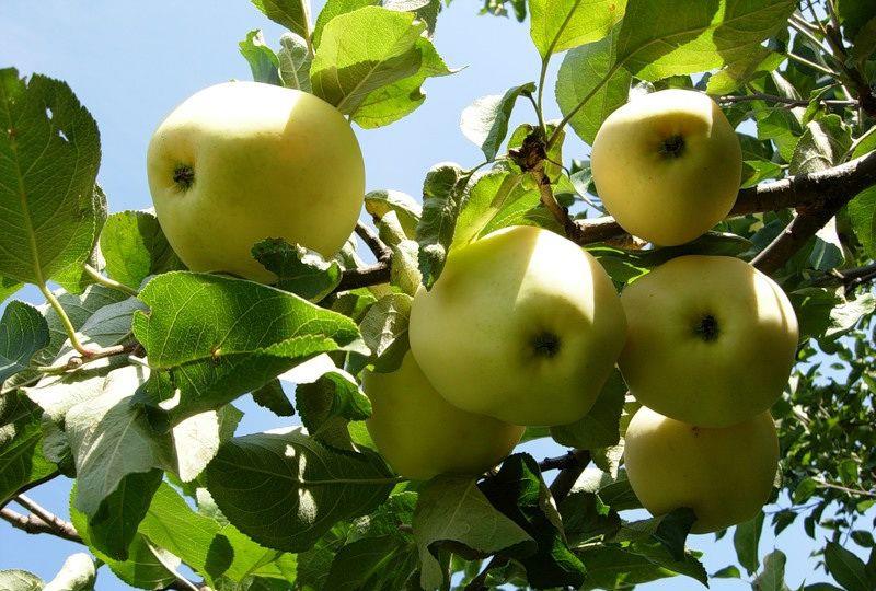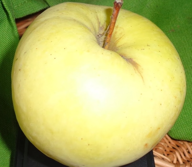 Плоды средней величины (125 г), плоскоокруглой формы. Основная окраска в момент съёмной зрелости зеленовато-жёлтая, покровная – красная в виде нежного размытого румянца по солнечной части плода.