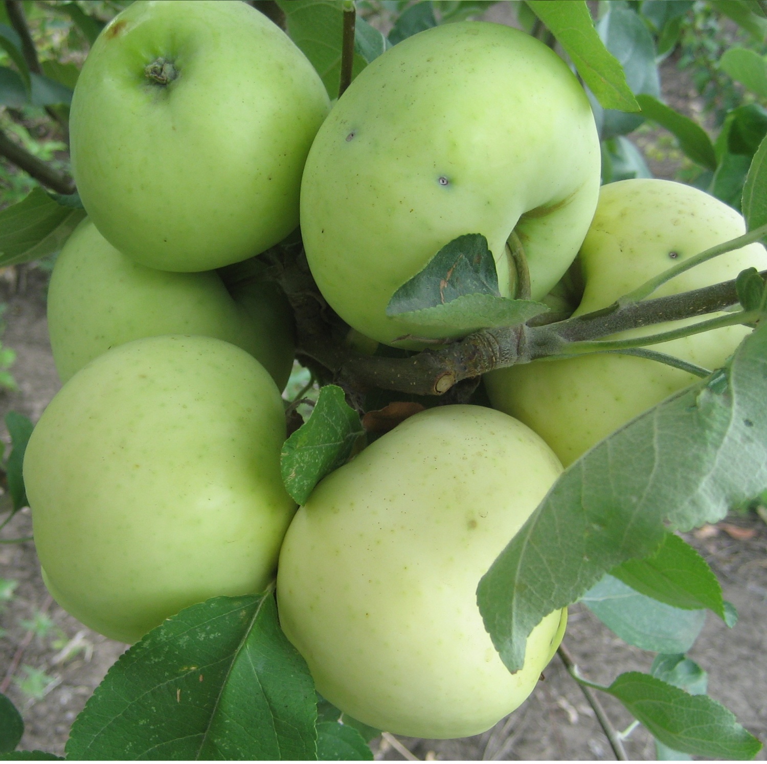 Плоды округло-конические, плавно сужающиеся к чашечке, равнобокие, зеленовато-белые имеют небольшой румянец с южной стороны. Средний вес яблока 60 г. (от взрослой яблони), 120-150 г. (от молодой яблони). Под тонкой, нежной кожицей проступают крупные зеленоватые, иногда белые точки.