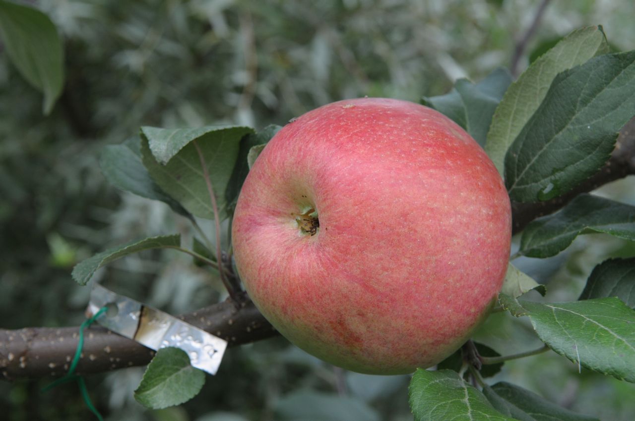 Плоды крупные или очень крупные (180 - 260 г.), жёлтые, с мраморно-красным, размытым румянцем по большей поверхности плода и белыми подкожными точками. Кожица слабоблестящая.